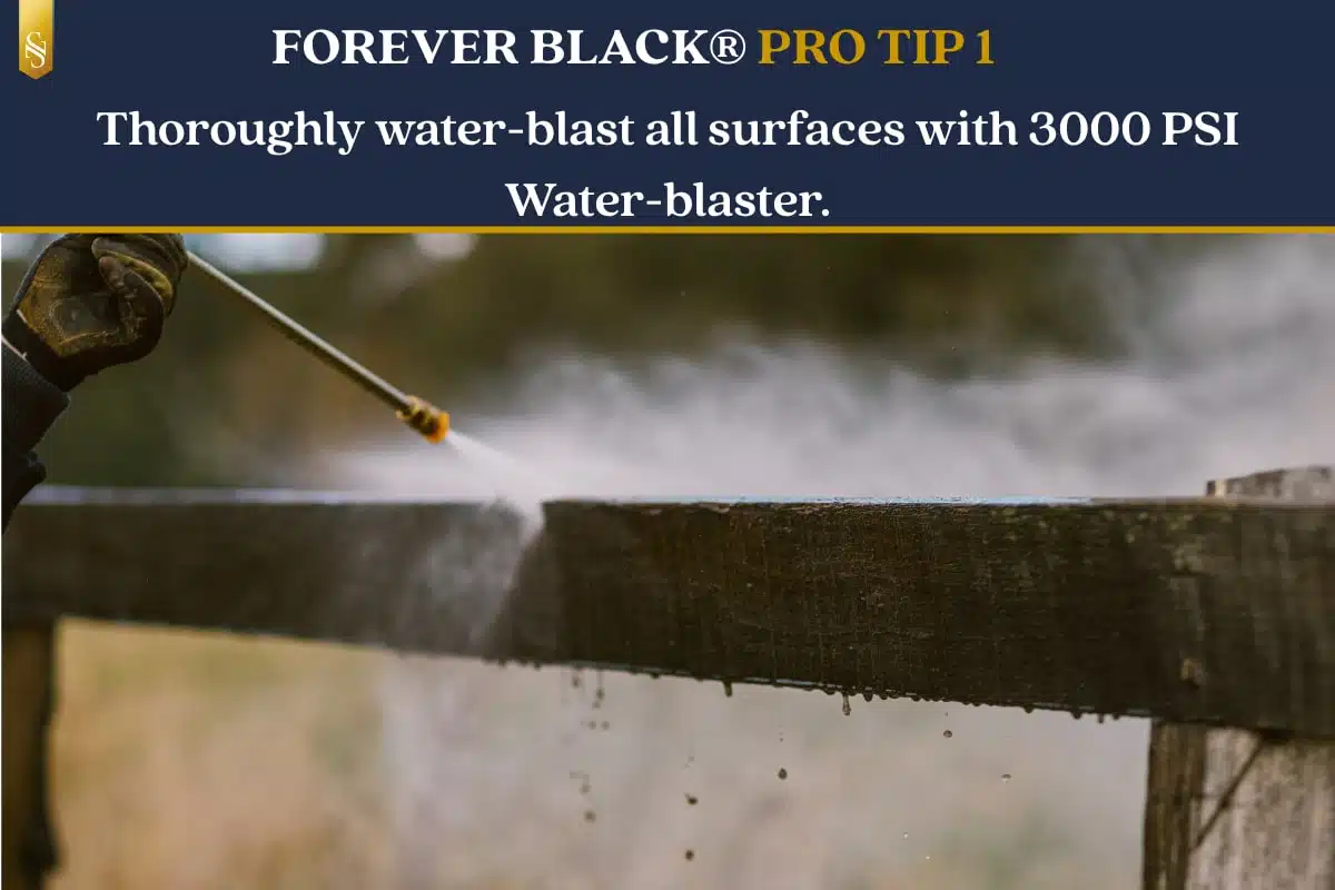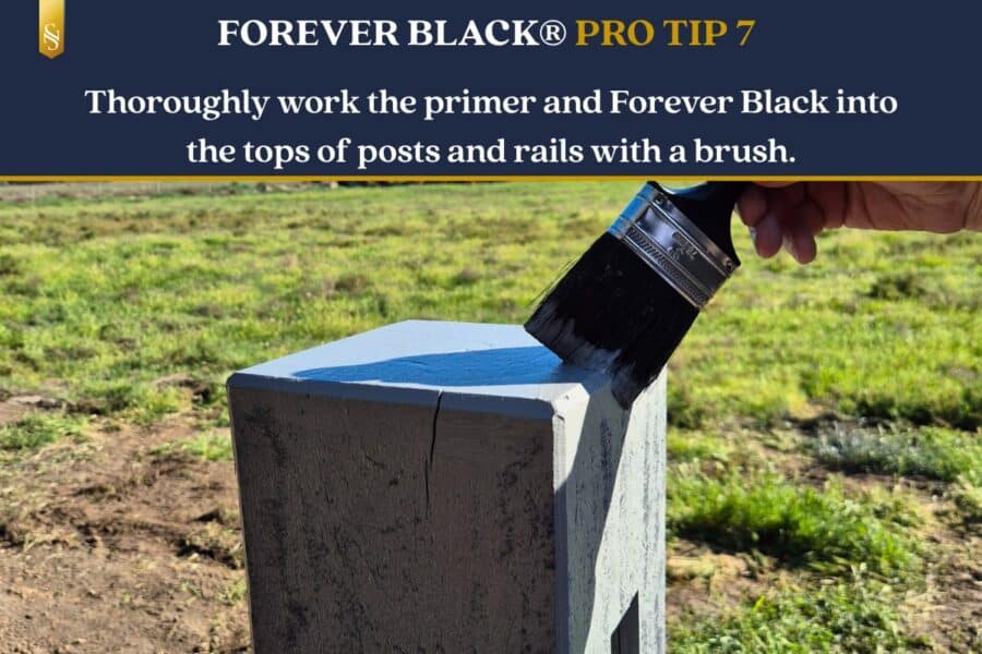 - Note: Pay particular attention and thoroughness to the tops of your rails and posts when applying the Forever Black. This part of the fence will cop the harshest treatment from the midday sun and in particular little droplets of dew or rain which have a magnifying effect when the sun shines through. So in short, at least 2 x solid coats to the tops of the posts and rails making sure it is thoroughly bonded.